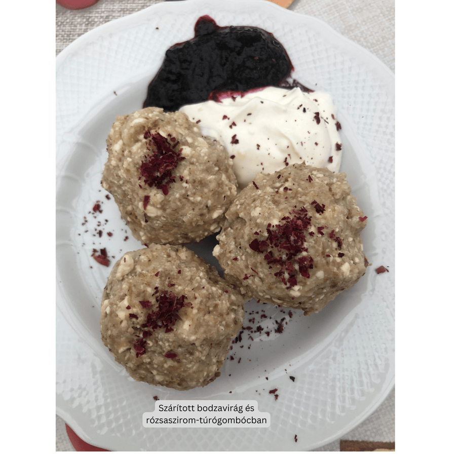 A gombócok az előző képen látható virág alapanyagokból és csipkemaglisztből készültek, mézes tejföllel és áfonya lekvárral