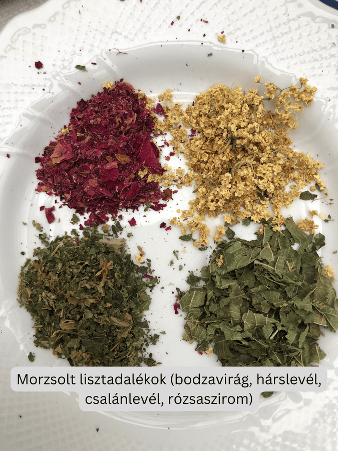 A képen balról jobbra látható a morzsolt rózsaszirom és bodzavirág szirom, alul morzsolt csalán és hárslevél, mint lisztadalék.